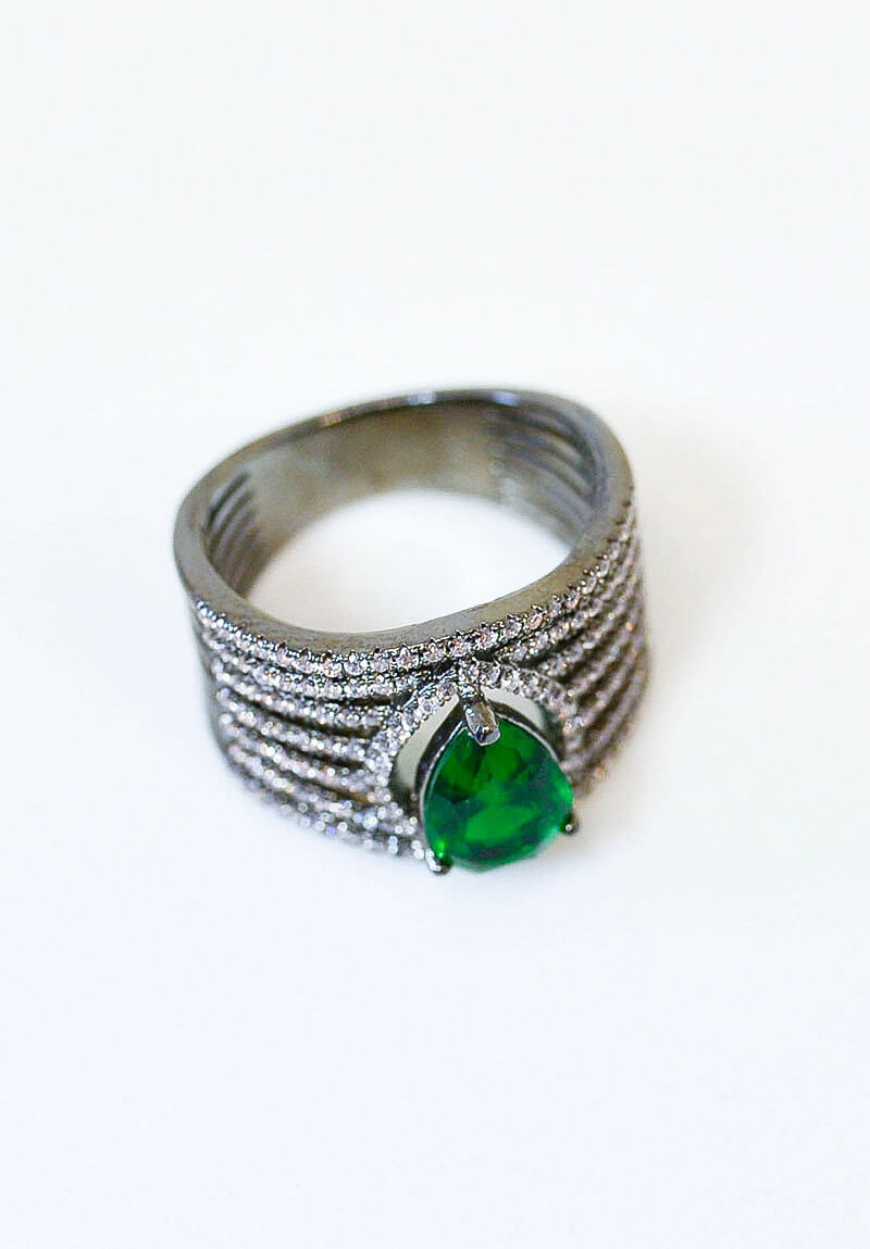 Anel com pedra verde esmeralda com detalhes em zirconia na cor rodio-negro, tamanho médio