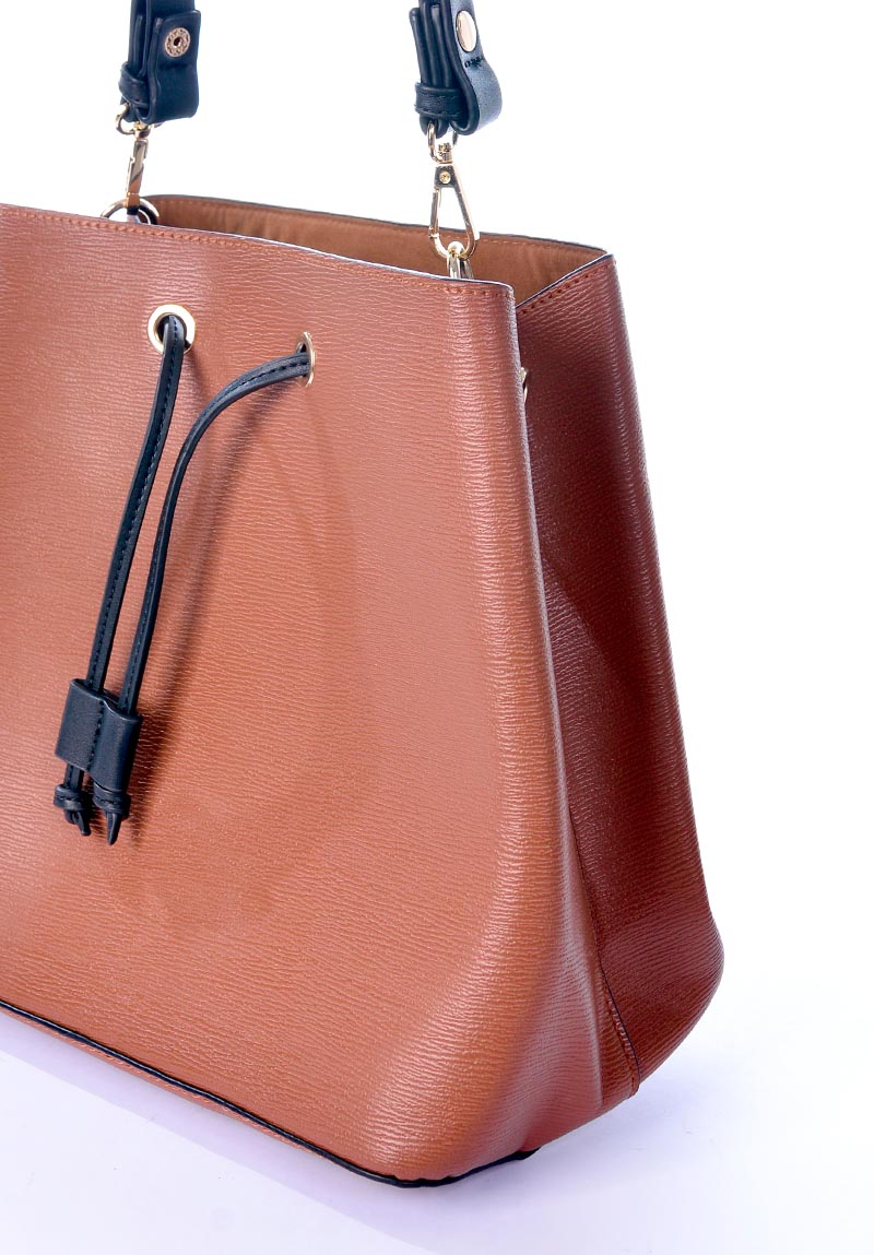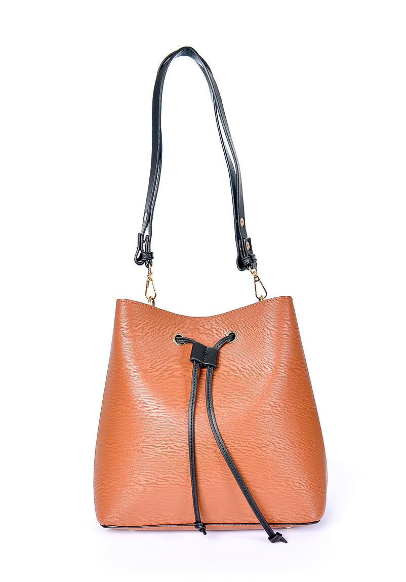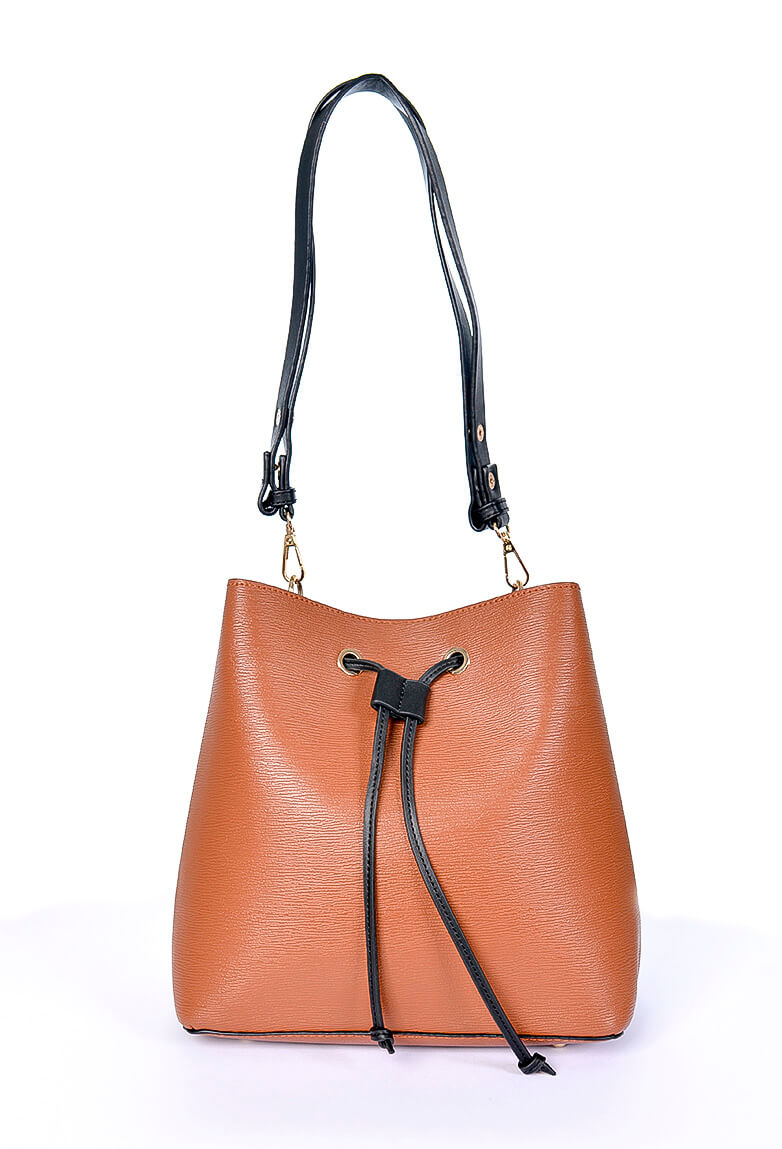 Bolsa tipo saco, na cor caramelo escuro, com detalhes em dourado, tamanho grande