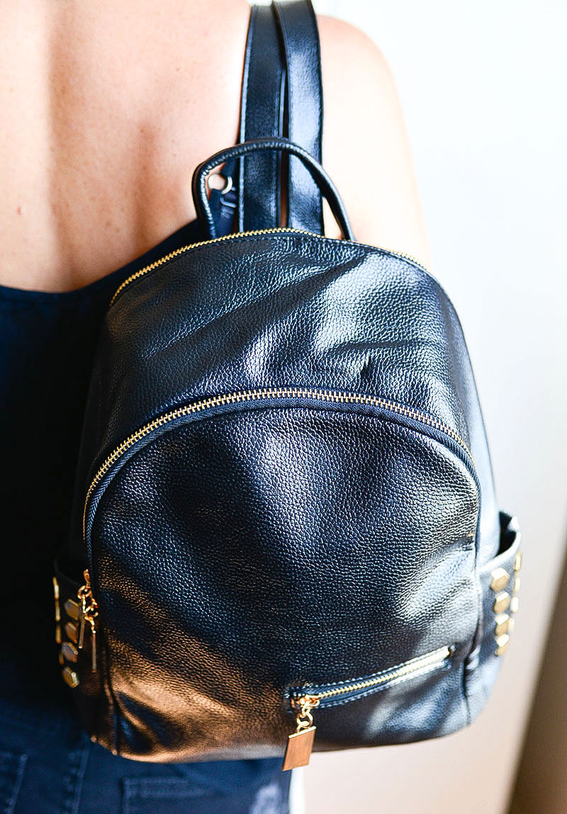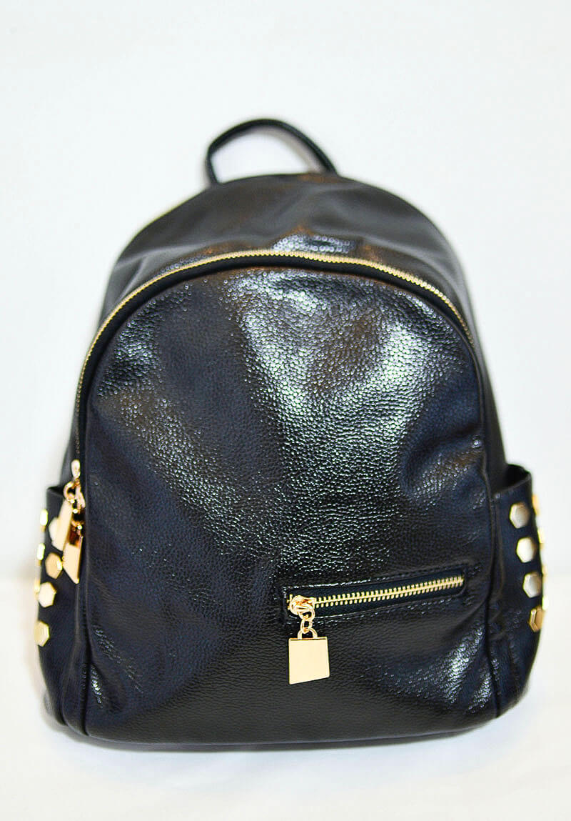 Mochila com taxas douradas na cor preta, tamanho médio.