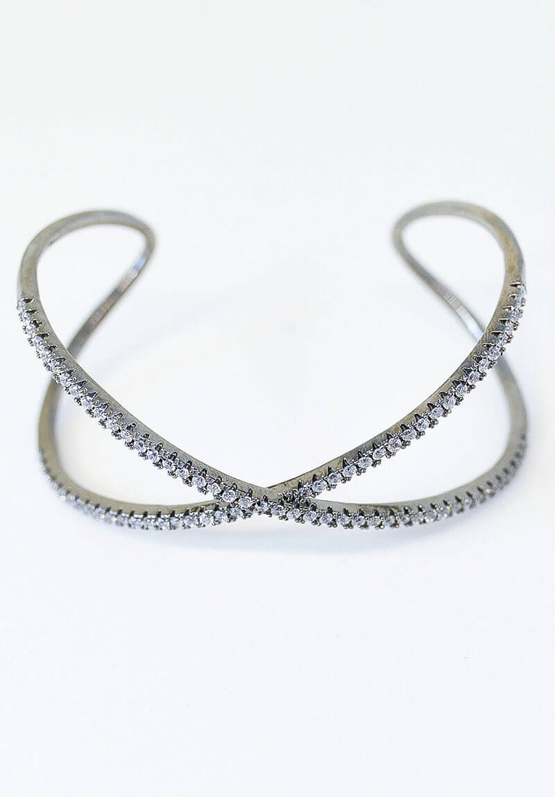 Bracelete em forma de X com detalhes em zirconia na cor rodio-negro, tamanho médio