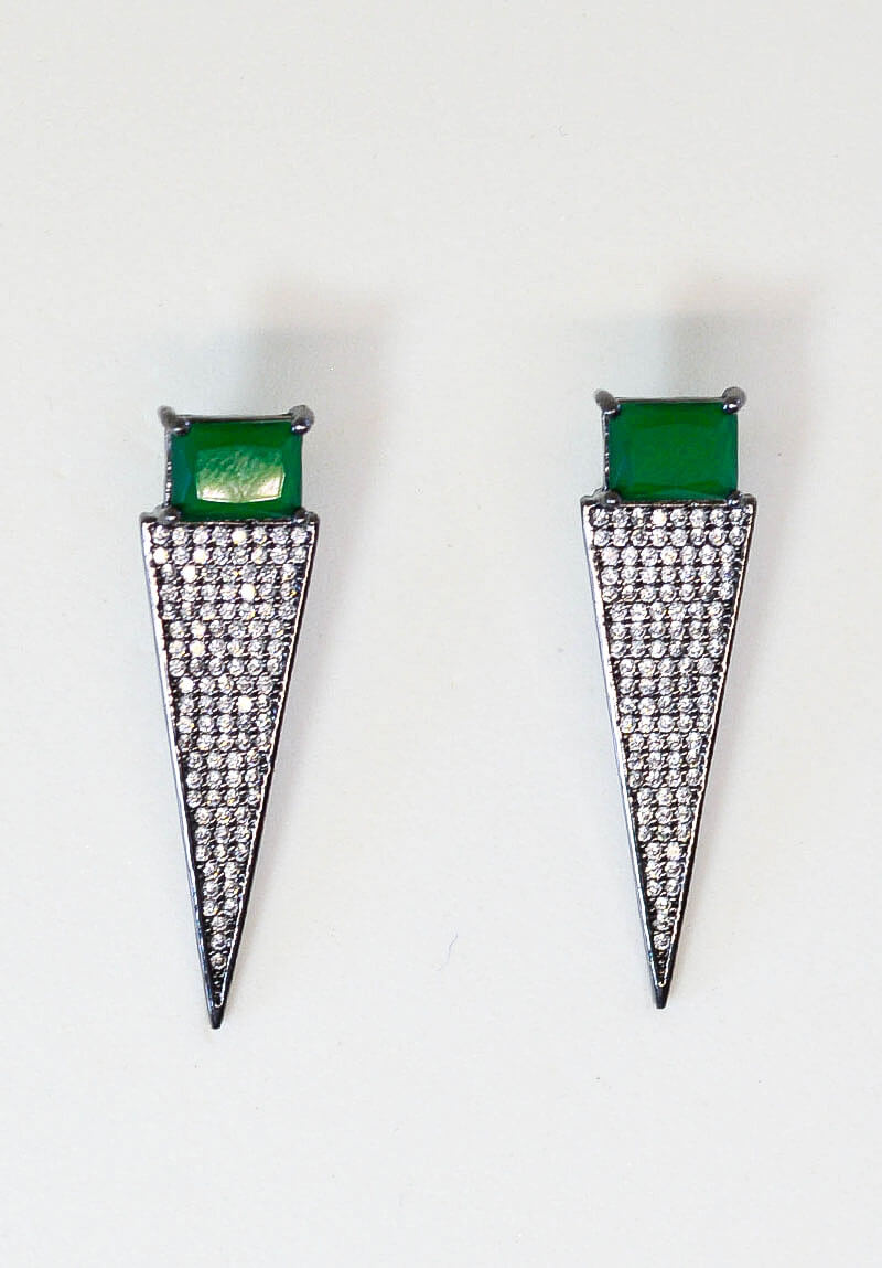 Brinco com pedra verde e triangulo com zirconia na cor rodio-negro, tamanho médio