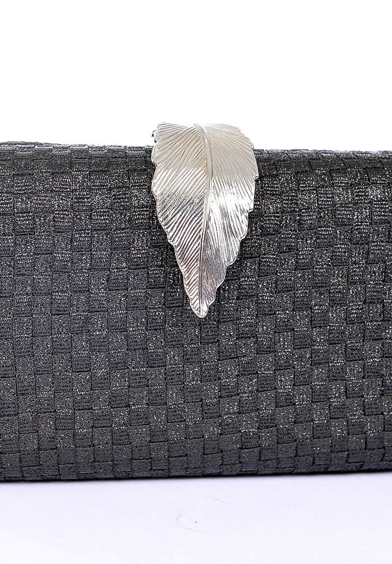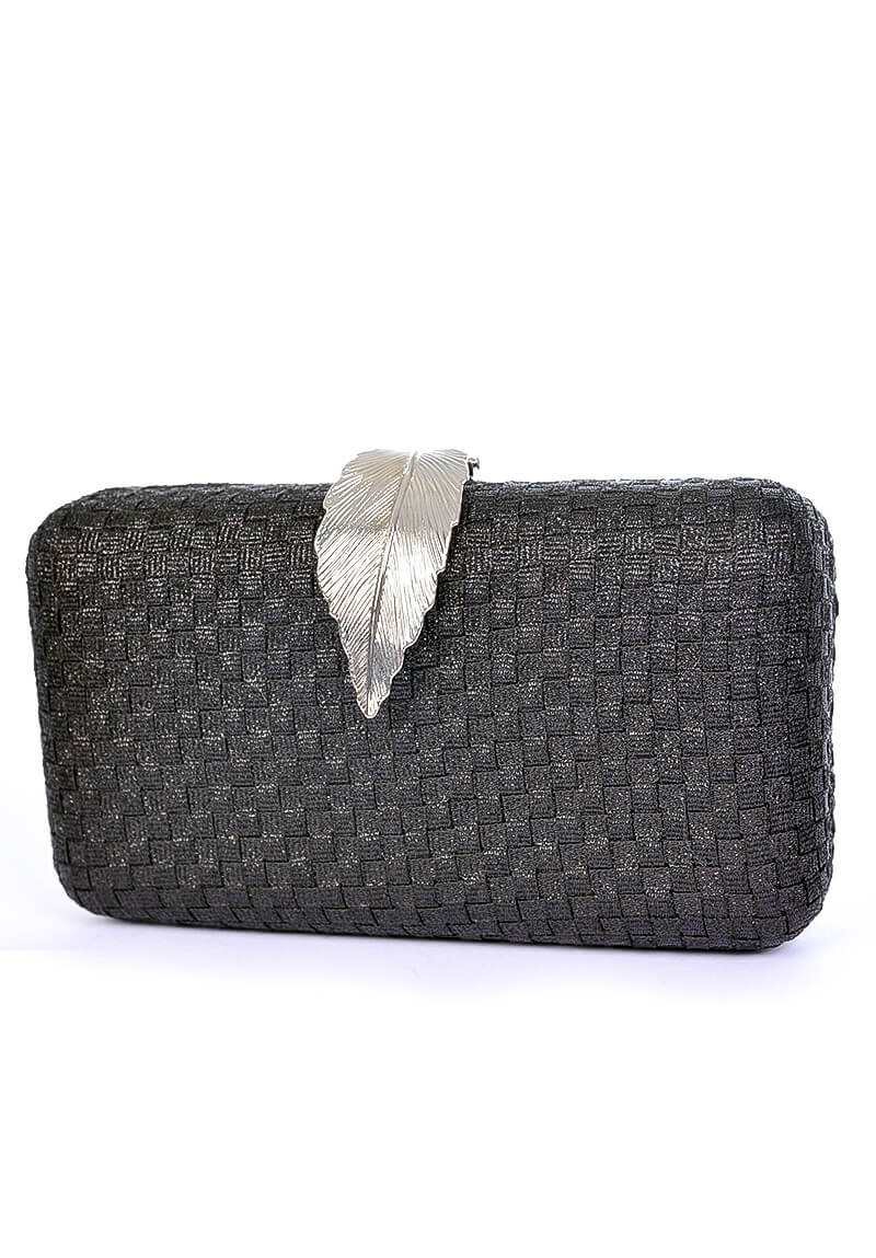 Clutch preta com feixo de folha prata, tamanho pequeno