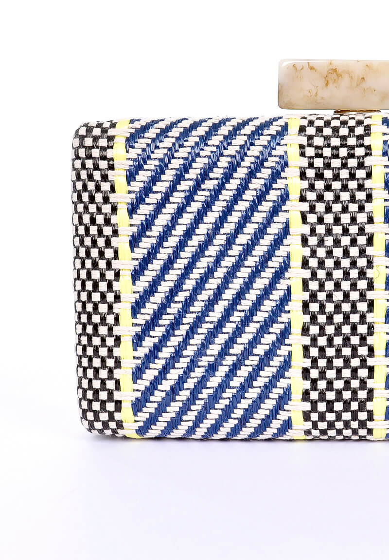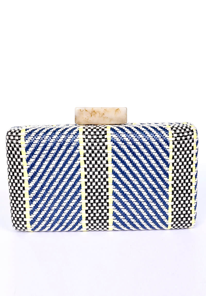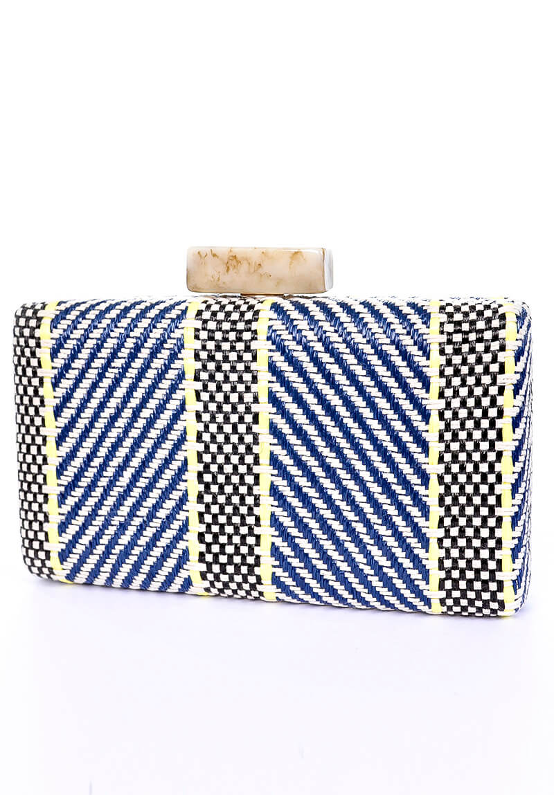 Clutch multicores nas cores, azul, branco, preto, e verde, tamanho pequeno