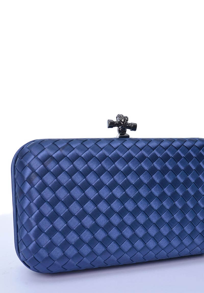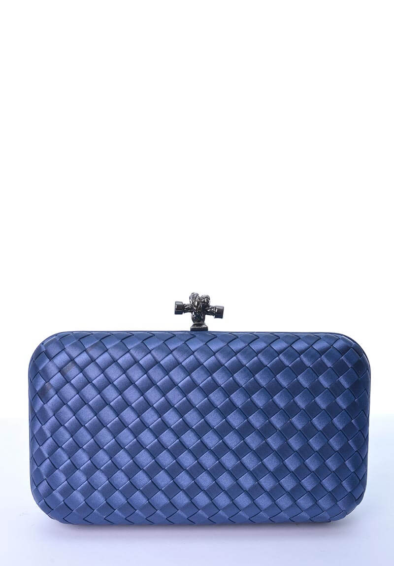 Clutch Inspiração France, produzida artesanalmente com trançado de poliester, e detalhe em metal, na cor azul marinho, tamanho pequeno