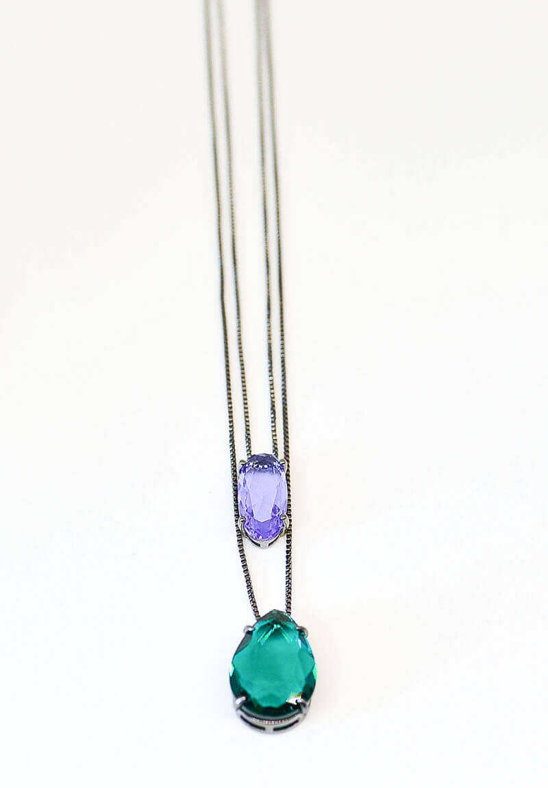 Colar Mix nas cores, violeta e verde esmeralda na cor rodio-negro, tamanho médio